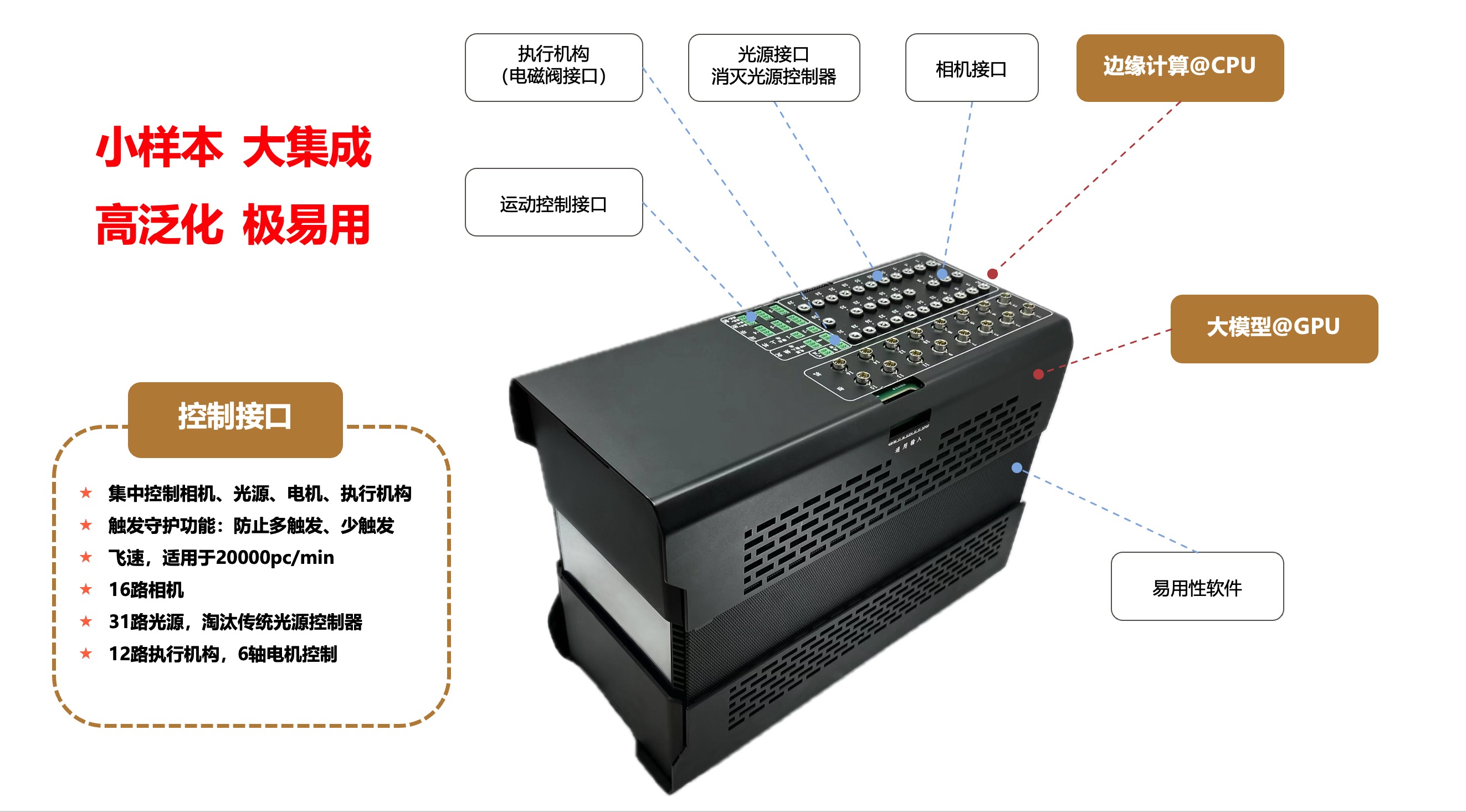 · 集中控制相机、光源、电机和执行机构。