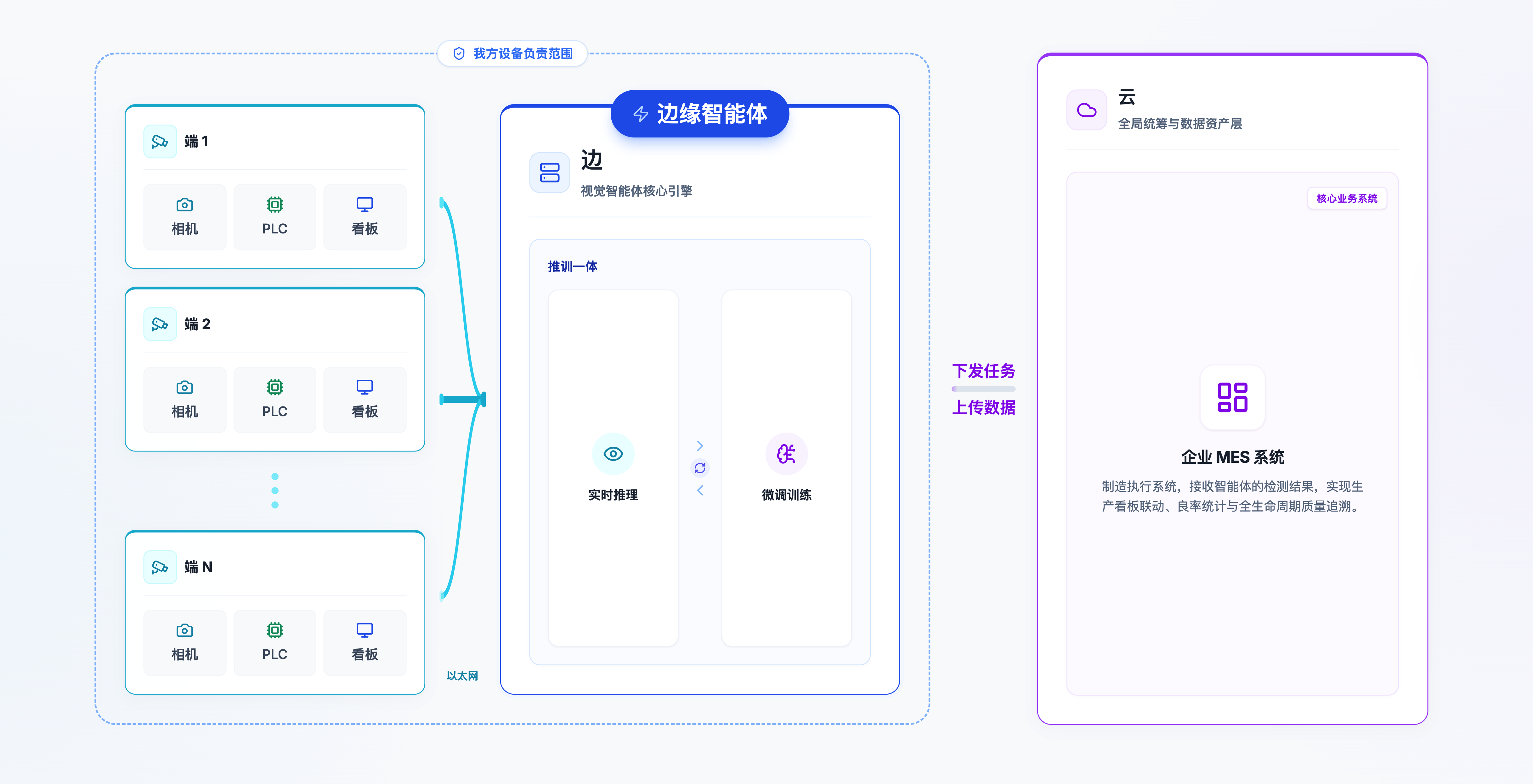 端侧设备由相机、PLC 和看板组成,检测任务在边缘智能体侧完成实时推理与微调训练,再与企业 MES 系统进行任务下发、数据上传和结果联动。